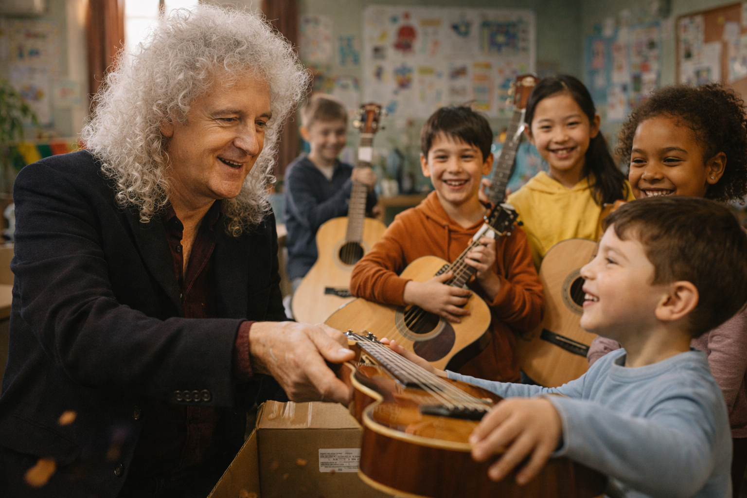 The room was small, its walls decorated with children’s drawings and handwritten dreams. When Brian stepped inside, the children didn’t see a rock legend at first — they saw a man with kind eyes, silver curls, and a warm smile who knelt down to their level and asked a simple question: