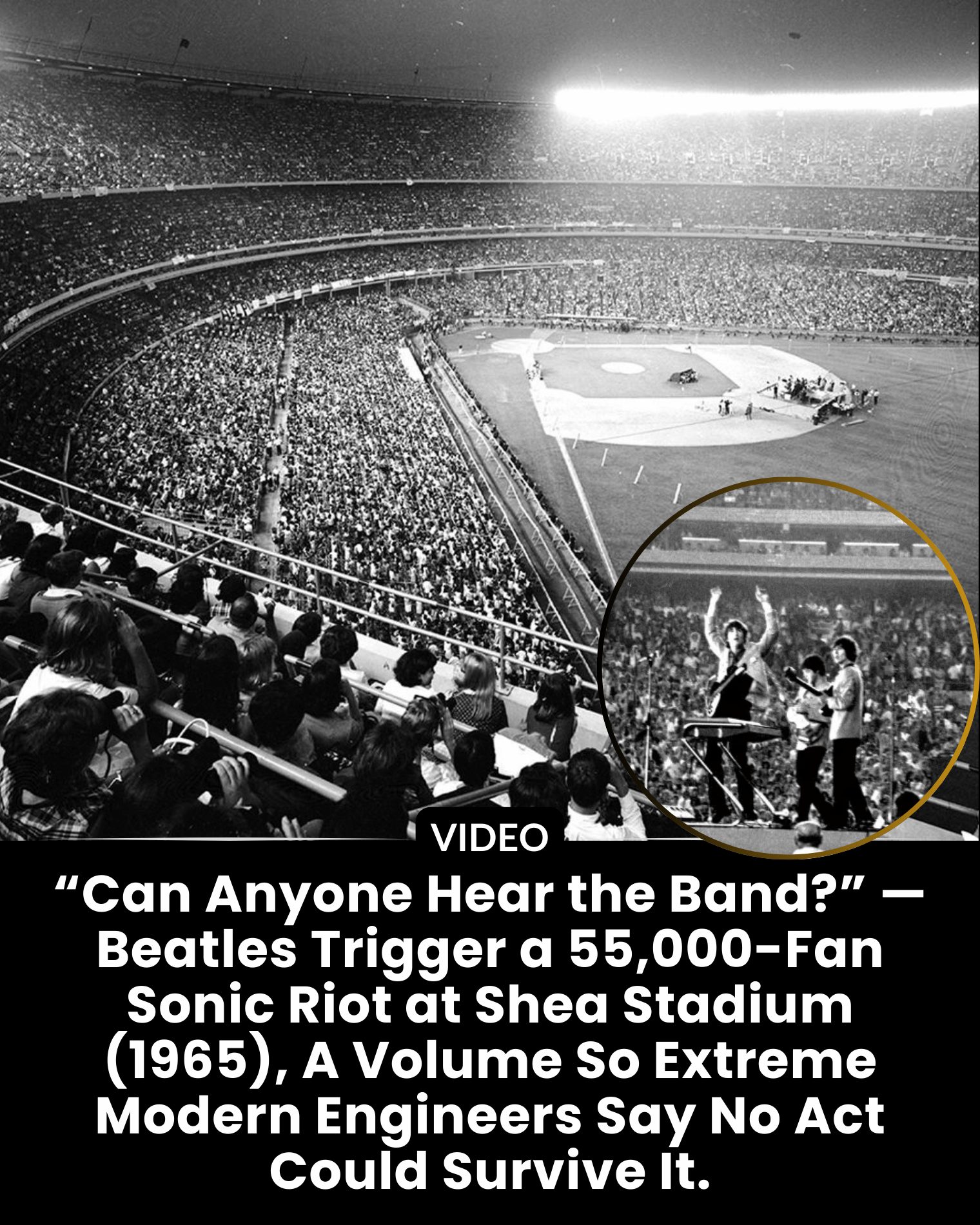 It was not a concert. It was a **mass acoustic event** that defied the very physics of performance. On August 15, 1965, at Shea Stadium, 55,000 voices—mostly young, mostly screaming—did not accompany The Beatles. They **drowned them.** The sound was measured later not in decibels, but in comparison: a **constant, rolling sonic wave equivalent to a jet engine at takeoff,** peaking at an earth-shaking **115 decibels.**