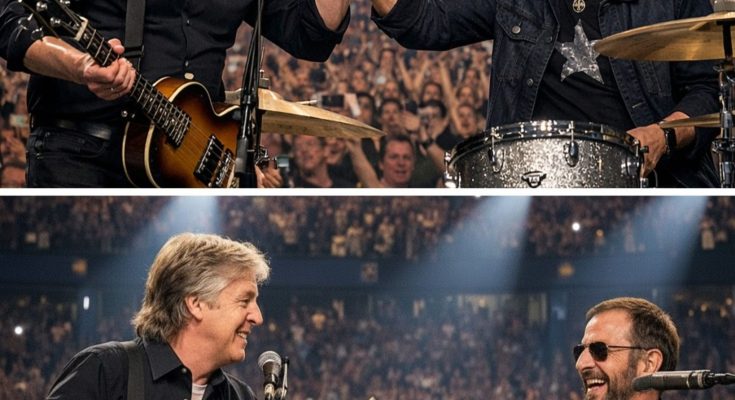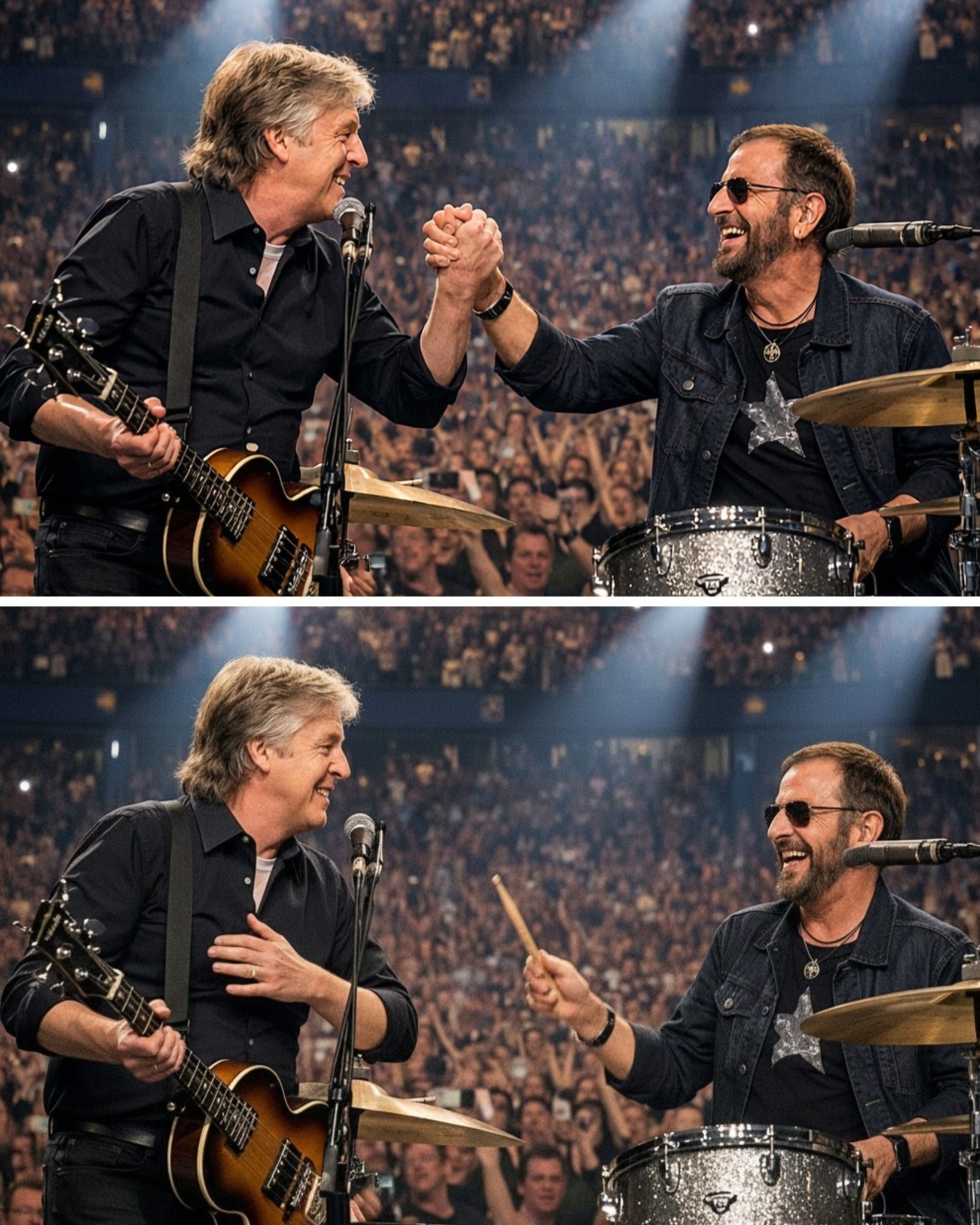 Then, Ringo—ever the timekeeper—simply turned and took his place behind the spare drum kit that had been quietly set up during the encore. He picked up the sticks, tapped the hi-hat twice, and without a word, crashed into the unmistakable, primal opening beat of **”With a Little Help From My Friends.”**