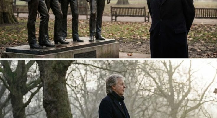 **Paul McCartney** stood alone. No entourage, no security cordon. Just a man in a dark coat, hands in his pockets, facing the frozen likenesses of his youth, his brothers, his life. He had come without announcement, and for a long, still moment, he simply **looked.**