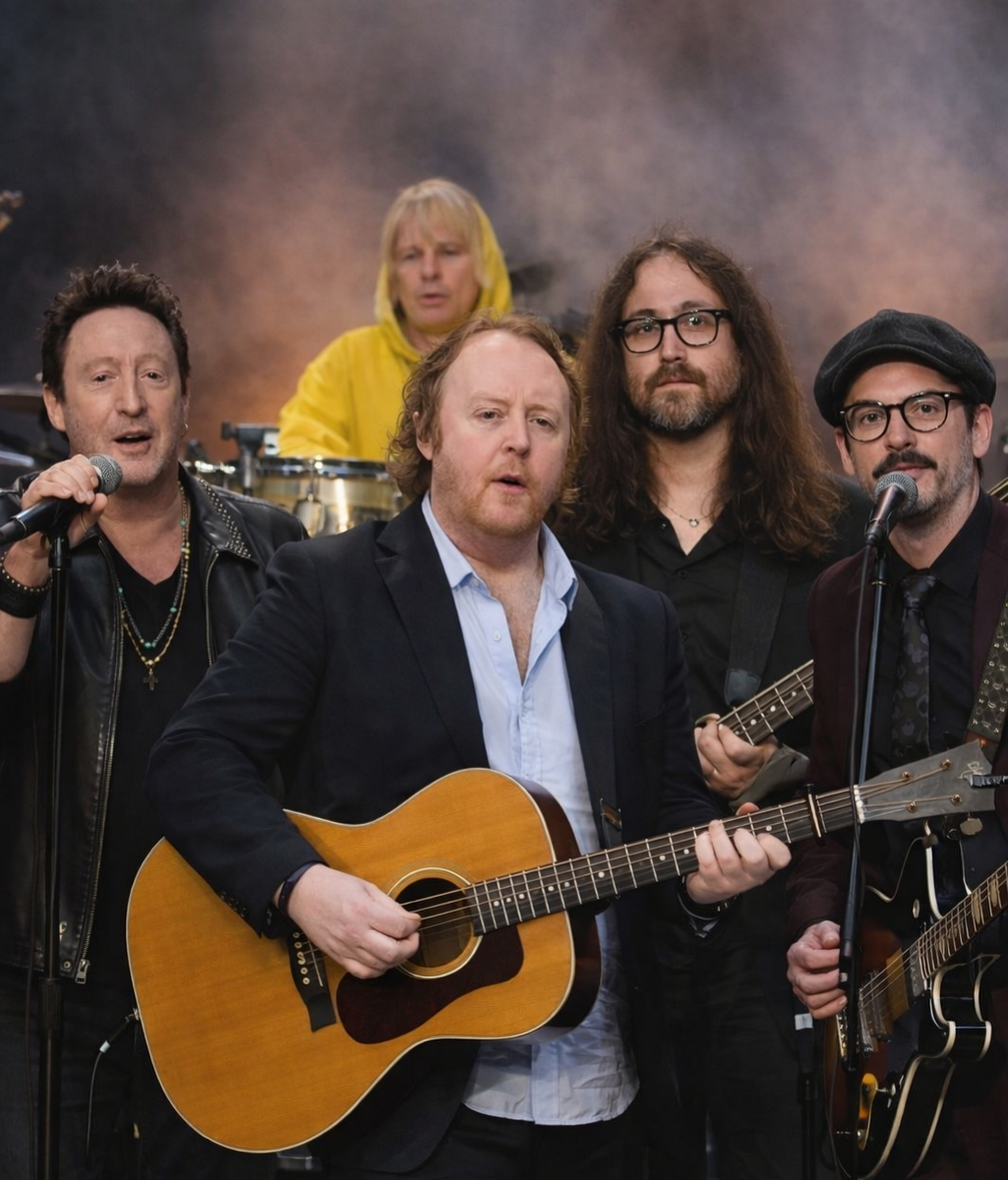 The setting was not a stage, but a circle. Five chairs, five men: **Julian Lennon, Sean Ono Lennon, James McCartney, Zak Starkey, Dhani Harrison.** For decades, they have existed in the public imagination as shadows, protectors of a flame, often silent in the face of a world that desperately wanted them to be something else. Tonight, in a conversation stripped of performance, they broke that silence.