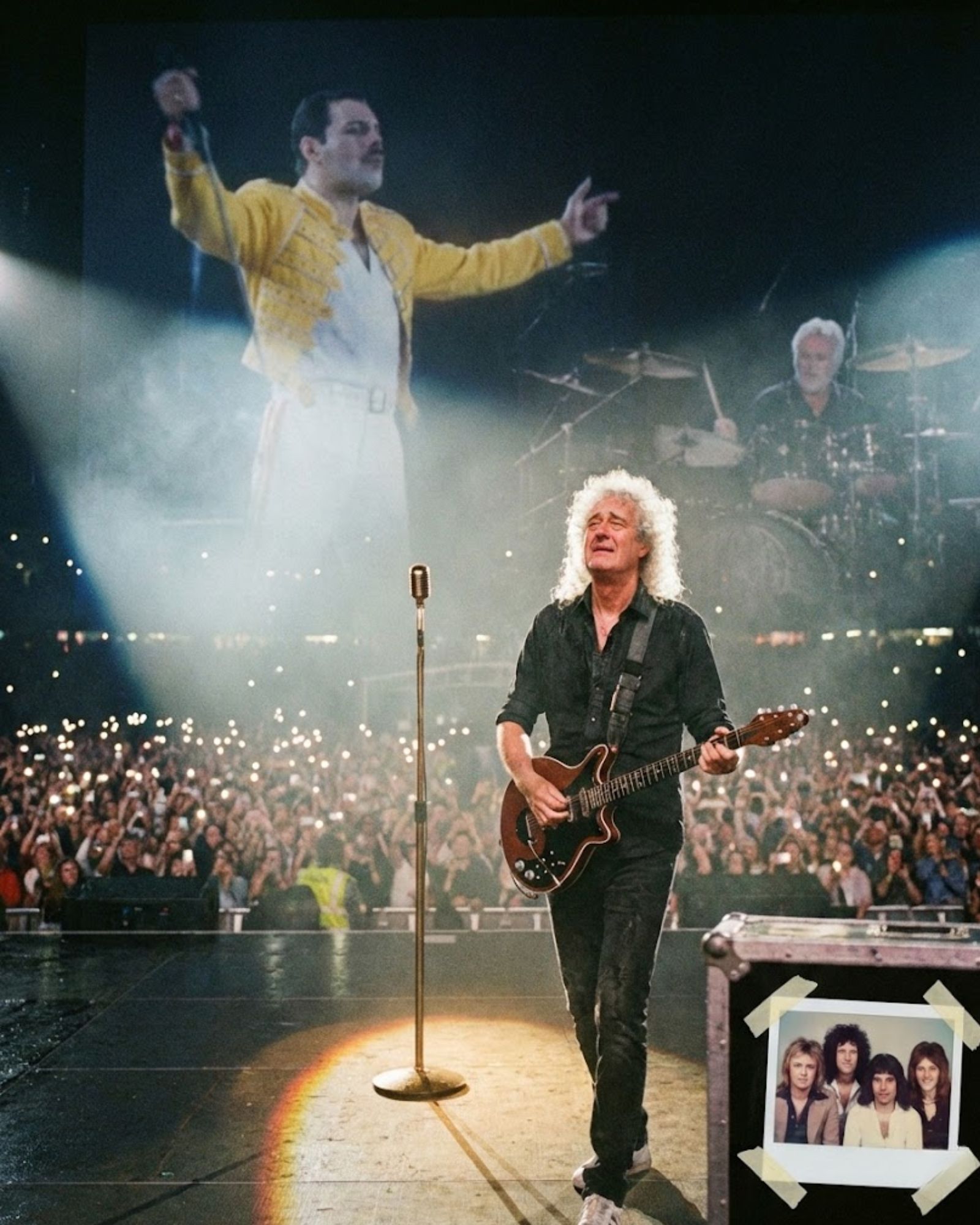 No bow. No wave. He simply turned, his eyes glistening, and walked back into the light, leaving the empty stand illuminated behind him. In that gesture—part technician, part widower, part brother—he said everything. He confirmed that the stage would always have a space for Freddie Mercury. That the music was a shared creation that death could not revoke. That some conversations never end; they just change their medium.