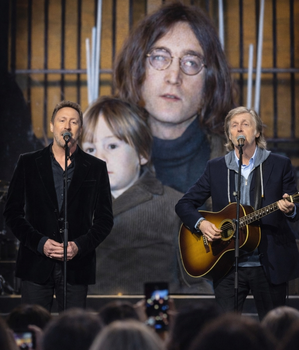 Julian, 62, had never performed the song publicly. His voice trembled on the first verse. McCartney, 83, shifted to harmony and placed a hand on his shoulder. They finished side by side.