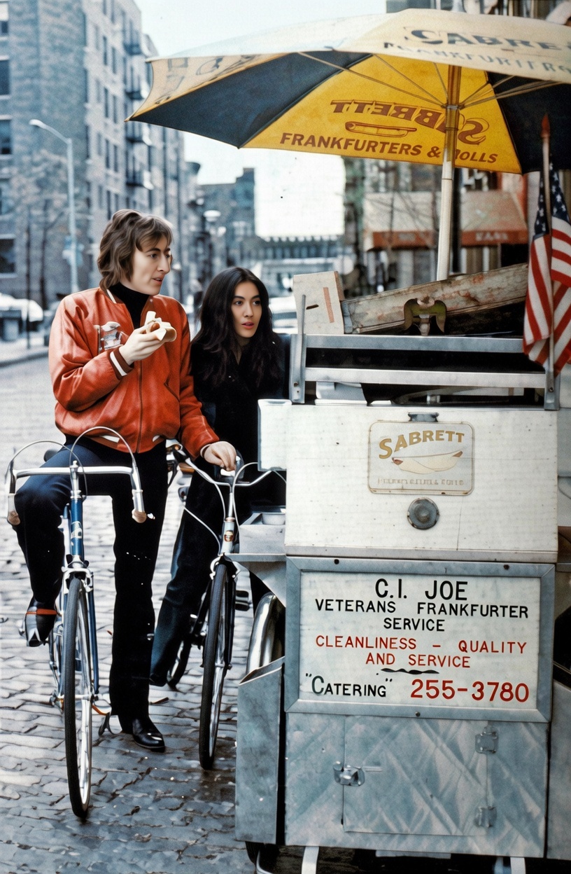 The G.I. Joe Veterans Frankfurter Service stand was a New York institution — run by veterans, serving classic hot dogs to anyone with change in their pocket. Lennon and Ono became regulars, their unpretentious snack choices reflecting their embrace of city life.