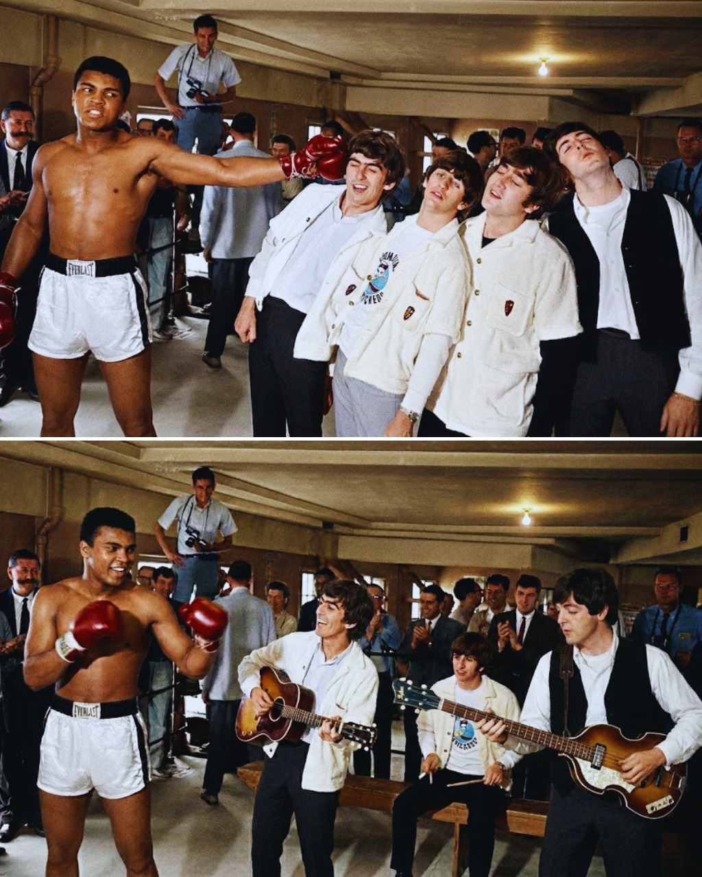 A newly surfaced 1964 clip is sweeping social media, revealing the scene that followed the famous image of Muhammad Ali (then still Cassius Clay) pretending to knock out a laughing John Lennon. The photograph captured the pose. The footage captures something else entirely: spontaneous creation between two of the most electric figures of the twentieth century.
