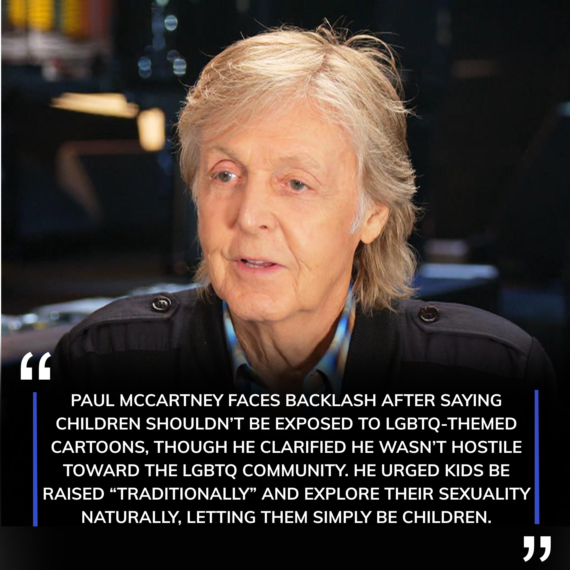 “I believe children should be allowed to grow up in a traditional way,” McCartney was quoted as saying. “They should be allowed to explore their own feelings and their own sexuality naturally, in their own time. My concern is that adults are pushing complex themes onto them before they’re ready. We need to let kids simply be kids.”