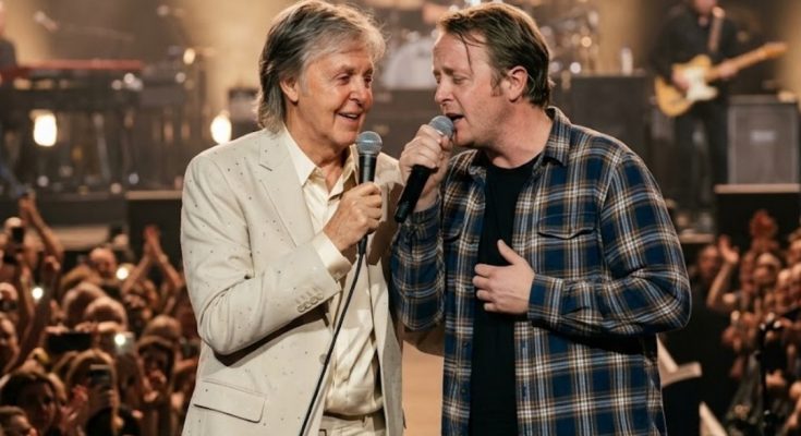 When the final note faded, James leaned closer and whispered something to Paul. No microphone caught the words. It was not meant for the crowd. Paul smiled — a small, emotional smile rarely seen on stage, the kind that comes not from performing but from something deeper. He placed his hand on James’s shoulder and gave a slight nod.