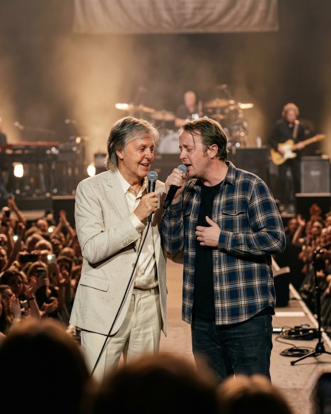 When the final note faded, James leaned closer and whispered something to Paul. No microphone caught the words. It was not meant for the crowd. Paul smiled — a small, emotional smile rarely seen on stage, the kind that comes not from performing but from something deeper. He placed his hand on James’s shoulder and gave a slight nod.
