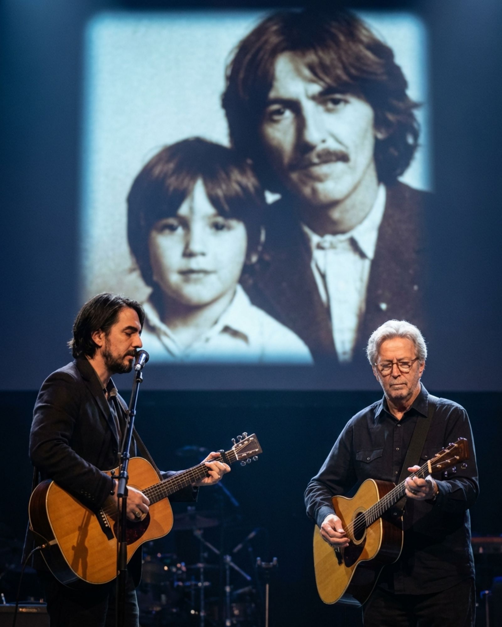 Dhani’s voice carried the outline of a father he didn’t have to explain. It wasn’t a imitation — he wasn’t trying to sound like George. But there was something in the phrasing, in the way he held certain notes, in the quiet confidence of someone who had grown up in the shadow of a legend and had made peace with it long ago. Clapton’s guitar answered slowly, gently, as if every note knew exactly where it came from — and who it belonged to.