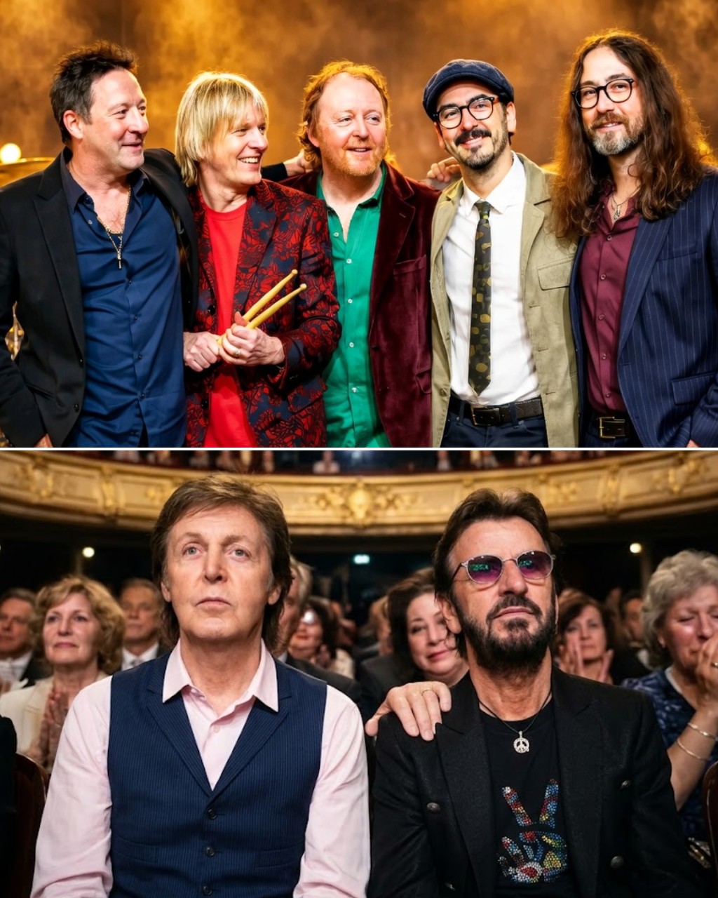 At a quiet, stripped-back performance, Julian Lennon, Sean Lennon, Dhani Harrison, Zak Starkey, and James McCartney came together to perform “Hey Jude,” a song deeply tied to their fathers’ legacy. Those present say even Paul McCartney and Ringo Starr watched in silence while the moment unfolded — not as a tribute spectacle, but something far more personal and restrained.